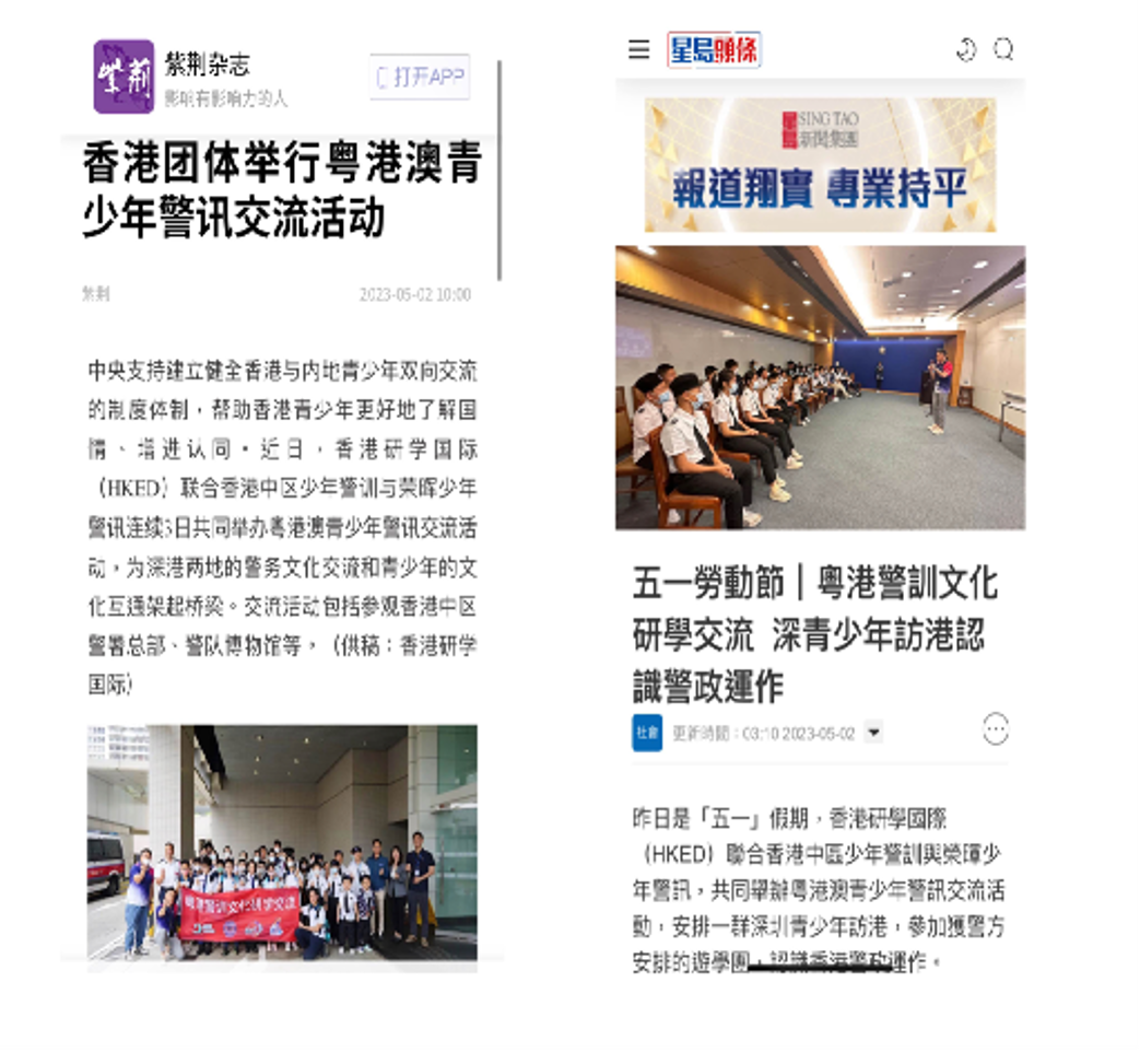INTERNATIONAL CULTURAL EXCHANGE 一次研学,一生视野 香港/海外寒暑假遊學/研學 Winter and Summer Study Tours / Educational Trips in Hong Kong and Overseas 知識科普型 基於各種類型的博物館、科技館、主題展、動植物園、歷史遺產、工業專案、科研場所等資源而打造。這一類研學旅行產品通過向學生展示歷史文物、藝術作品、科技成果、工業生產和科學實驗,並設定一定的區域供學生體驗,進行常識教育和科學普及。 勵志拓展型 包括了紅色教育基地,大學校園、國防教育基地和軍營等資源。這一類產品旨在增強青少年愛國主義情懷,塑造正確的世界觀、人生觀和價值觀。 探索自然型 包括各類自然保護區、地質公園、生態旅遊景點等資源。通過親身參與戶外活動,如徒步、探險和野生動植物觀察,培養學生的自然探索精神,增強對生態環境保護的意識。 文化康樂型 包括各類主題公園、演藝影視城等資源。這類產品緊跟時代藝術潮流,通過參與公園中的專案和考察影視城,提高學生的文化影視鑒賞能力,在專業知識教育之外,增加研學旅行的趣味性。 體驗考察型 包括農莊、實踐基地、夏令營營地或團隊拓展基地等資源。這類產品強調集體參與和實踐過程,通過實際參與掌握一定的技能,例如種植採摘、緊急救護、野外穿越等,旨在培養學生的防災技能,磨練學生意志。 香港警訊文化研學交流 在香港與大陸全面恢復通關後的首個“五一”黃金周,“灣區少年·逐夢藍天”蘊含著灣區青少年攜手共進為夢想奮鬥的美好願景,也是HKedu首個少年警訊與少年警訓攜手香港中區少年警訊,舉辦為期三天的“灣區築夢行—粵港澳警訓文化研學交流活動”。也得到紫荊報社和星島頭條五一新聞報導體現研學公益的核心之一。 香港青少年總軍會 香港青少年軍總會是一個提供紀律訓練和教授中式步操的制服團體。有助於幫助青少年培養堅強意志,學習自律自省,踐行刻苦精神。 帆船運動 與啟航俱樂部聯合開展粵港澳青少年帆船运动,为了可以让青少年也能参与帆船运动,从启航开始帆船运动的学习与体验,希望培育出更多相关人才,期望香港与内地俩地青少年能透过帆船活动借助「风」的推动与其配合大湾区的机遇,创造更多机会给香港与内地青少年相互学习,相互交流,通过团队精神让俩地青少年在帆船运动中能够:“以航海的方式去探索世界,用好奇心和热情开启一个精彩的世界。更让青少年在帆船运动中学到'风掌握机会,为自己创造未来. 灣區少年·逐夢藍天 HKedu代表香港少年警讯与广东少年警训及富翔航空共同举办粤港青少年-逐梦蓝天-深港警训春季研学交流活动。•航空科普实践教育基地深入打造航空研学主题精品课程建设共同助力“中国梦•飞行梦” OPENING HOURS Monday - Friday: 09:00AM - 17:00PM Saturday - Sunday: 09:30AM - 14:00PM Join The club Get updates on special events and receive your first drink on us! Email SUBSCRIBE Visit Us 22/F, China Huarong Tower, 6o Gloucester Road, Wan Chai, Hong Kong